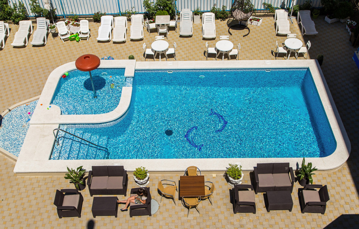 Общее количество бассейнов: 1 (глубина 2 метра), Открытый бассейн, Бассейны с подогревом